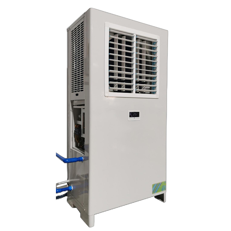 Floor-mounted indoor unit • Large air volume, low noise. • An embedded LCD touch screen controller for easy operation. • Automatically swing the inner flap from side to side. • Swing the outer flap up and down manually. • The distance of air supply can exceed 10 meters. • With a pre-filter, no need to clean the condenser. | Wall-mounted indoor unit • The jet tuyere can be manually adjusted to any direction. • An embedded LCD touch screen controller for easy operation. • The distance of air supply can reach 20 meters. • You can also change the jet tuyere into a duct interface. • With a pre-filter, no need to clean the condenser. | Outdoor unit • Wet curtain water film evaporative cooling. • reduces the temperature of condensed water to improve cooling effect. • Come with a float water refill device to prevent water shortage or overflow. • Comes with circulating water pump • Modular wet curtain, easy maintenance and disassembly. |